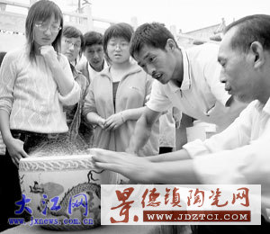 一“音樂噴泉”瓷缸吸引著眾多游客的目光。表演者用手在盛滿水的瓷缸缸沿輕輕一搓,瓷缸便發(fā)出清脆的響聲,缸內(nèi)的水就像噴泉一樣噴出,高度可達一尺左右。據(jù)悉,此缸名“龍珠缸”,內(nèi)繪四海龍王,外繪雙龍戲珠。梁振堂攝