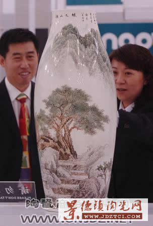 9月17日,兩名觀眾在欣賞高73厘米、最大直徑35厘米的藝術(shù)骨質(zhì)瓷瓶。該瓷瓶是第八屆唐山中國陶瓷博覽會(huì)上最大的骨質(zhì)瓷瓶。