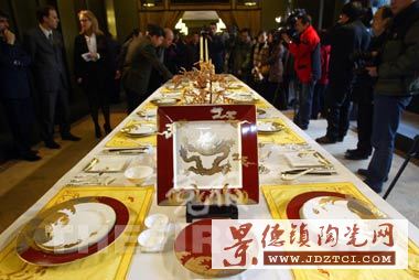 “這套瓷器的設(shè)計(jì)靈感來(lái)自古代皇袍的紋飾,設(shè)計(jì)師用了半年時(shí)間研究龍袍上的紋飾!睋(jù)此套瓷器生產(chǎn)廠家代表介紹, “福海騰達(dá)”系列餐具每套價(jià)值25萬(wàn)元,均附有故宮博物院監(jiān)制證書(shū),其中包含大方龍盤、餐盤、湯鍋、茶杯、燭臺(tái)等共計(jì)206件作品。