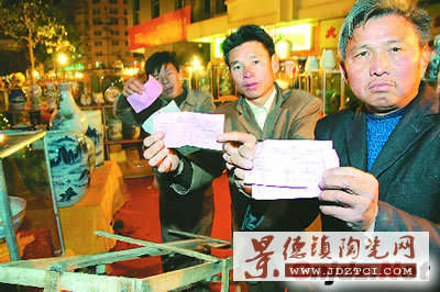昨晚,多位江西瓷商手拿繳費(fèi)收據(jù),欲哭無淚,向記者投訴瓷展組織者卷款“閃人”。原來,11月中旬,43戶江西景德鎮(zhèn)瓷商由徐某某組織來肥,在蒙城北路正豐花市路邊舉辦陶瓷展銷會,每戶交了約2500元共8萬多元的參展費(fèi)。可剛展出幾天,徐某某就不見了蹤影。他承諾的花錢打廣告等多項(xiàng)內(nèi)容并未兌現(xiàn)。