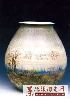 涂志浩的《晨曦》,充分運(yùn)用高溫顏色釉的千變?nèi)f化,并以低溫粉彩、新彩加強(qiáng)表現(xiàn)形式。他大膽運(yùn)用傳統(tǒng)的線,和陶瓷色彩相融合,表現(xiàn)對(duì)大自然的熱愛。作品上部米黃,淡黃釉呈絲狀下流。作品的中部畫上了幾棵大樹,幾隻鴛鴦,色彩處理的協(xié)調(diào)柔和,凸現(xiàn)晨曦的主題意境。粉彩、新彩的運(yùn)用使整個(gè)畫面充滿了朦朧、寂靜的情調(diào)