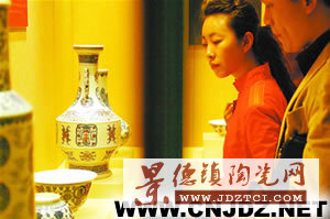 清乾隆年間的青花加紫夔龍紋壽字雙耳盤口瓶吸引觀眾駐足留連。