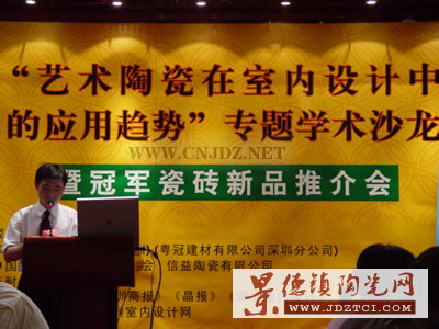 由深圳室內(nèi)設(shè)計(jì)師協(xié)會(huì)主辦,冠軍陶瓷協(xié)辦的“藝術(shù)陶瓷在室內(nèi)設(shè)計(jì)中的應(yīng)用趨勢(shì)”專題學(xué)術(shù)沙龍4月28日在格蘭云天酒店隆重舉行。出席嘉賓包括深圳室內(nèi)設(shè)計(jì)師協(xié)會(huì)副會(huì)長(zhǎng)兼秘書長(zhǎng)趙慶祥、深圳市室內(nèi)設(shè)計(jì)師協(xié)會(huì)高級(jí)顧問、中國(guó)建筑學(xué)會(huì)室內(nèi)設(shè)計(jì)分會(huì)副會(huì)長(zhǎng)、同濟(jì)大學(xué)博士生導(dǎo)師來增祥教授、信益陶瓷副總經(jīng)理王茂山先生、華耐·立家連鎖總裁賈鋒先生、粵冠建材公司總經(jīng)理王繼紅先生等,同時(shí)出席發(fā)布會(huì)的還包括來自行業(yè)內(nèi)近百位設(shè)計(jì)師以及媒體代表。