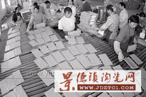 近年來,易門縣通過引進(jìn)福建、廣東等客商做大做強(qiáng)建筑陶瓷業(yè)。到目前已有7家陶瓷墻地磚生產(chǎn)企業(yè)在該縣落戶,其中已投產(chǎn)的6家企業(yè)2005年共生產(chǎn)墻地磚655萬平方米,實(shí)現(xiàn)產(chǎn)值4893萬元。圖為易門國(guó)星瓷業(yè)有限公司員工在包裝墻磚。