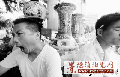 七十來家景德鎮(zhèn)瓷商在杭州市體育館安營扎寨至今已近一個(gè)星期,清淡的生意加上連日高溫使他們備受煎熬。瓷商們紛紛訴苦“連吃飯的錢都沒掙到”。記者采訪到的瓷商都是第一次來杭州,他們不知道此前他們的同行已屢次在杭含淚砸瓷。