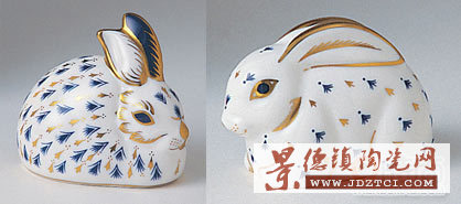 故事可以追溯到1970年末,當(dāng)時Royal Crown Derby的設(shè)計總監(jiān)Jo Ledger首先想到將Royal Crown Derby最經(jīng)典的伊萬里風(fēng)格圖案用在造型簡單的小雕像上,進而開發(fā)出鎮(zhèn)紙系列。這個系列推出的第一批鎮(zhèn)紙是“Five Birds and a Rabbit”(五只鳥和一只野兔),現(xiàn)在很多新推出的設(shè)計仍能在它們身上找到影子。這六件最初的鎮(zhèn)紙現(xiàn)在唯有22K純金描繪的“Rabbit”仍在生產(chǎn),其他已經(jīng)絕版。Royal Crown Derby沿用這只野兔造型創(chuàng)作出了一只白金鎮(zhèn)紙用以慶祝鎮(zhèn)紙系列25周年銀色華誕。后來經(jīng)過設(shè)計師們討論,沒有Baby對兔媽媽來說是不公平的,所以就有了大家現(xiàn)在看到的Rabbit母子鎮(zhèn)紙,鈷藍色和白金色結(jié)合的完美設(shè)計帶來一種出乎意料的視覺感受。