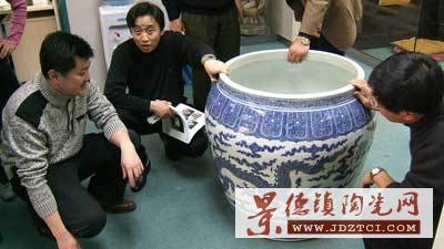 這只大缸近1米高,直徑有六七十厘米,缸身有五爪金龍和云紋花飾。據(jù)該公司負(fù)責(zé)人魯智勇介紹,這是迄今為止我國(guó)發(fā)現(xiàn)的最大的明代青花瓷缸。景德鎮(zhèn)龍珠閣博物館存有一件類(lèi)似的宣德大缸,可惜是用殘破的瓷片拼成的,而且比即將拍賣(mài)的這只小。魯智勇透露,這只大缸原本保存在景德鎮(zhèn)附近某明代王府的老宅中,8年前,一位武漢的收藏家,以極低的價(jià)格買(mǎi)下這只大缸。誰(shuí)知,那位藏家將大缸運(yùn)回武漢后,卻因缸體太大,無(wú)法進(jìn)門(mén),只得存放在郊區(qū)農(nóng)村的一所柴房中。魯智勇見(jiàn)到這只大缸時(shí),只見(jiàn)柴房不遠(yuǎn)處就是一處豬圈,大缸蒙著一塊白布,放在角落里。