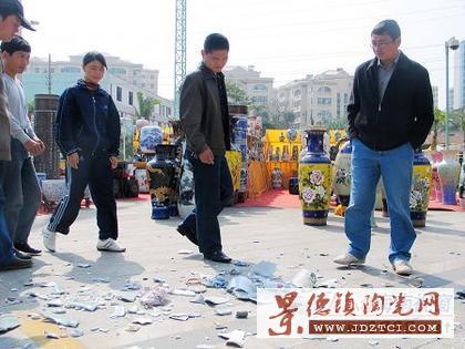 約15分鐘后,記者趕到事發(fā)現(xiàn)場(chǎng)。在宜欣廣場(chǎng)西側(cè)的空地上,記者發(fā)現(xiàn)滿地都是瓷器碎片,數(shù)名面色凝重的中年男子正在收拾瓷器殘片,其中一位姓江的中年男子告訴記者,2006年11月底,60家景德鎮(zhèn)瓷器經(jīng)銷商通過(guò)一位中介商,把上萬(wàn)件陶瓷制品千里迢迢從江西運(yùn)到?趤(lái)銷售,但沒(méi)有想到市場(chǎng)如此蕭條,至今2個(gè)多月過(guò)去了,瓷器沒(méi)有賣出幾件,錢卻花了不少,大家一時(shí)沖動(dòng)就當(dāng)街摔砸瓷器來(lái)出氣。