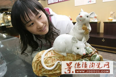 11月9日,一位女孩在觀賞一款造型可愛的陶藝鼠。