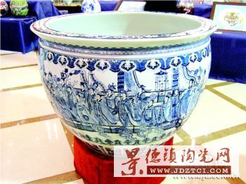 該作是好運北京景德鎮(zhèn)名品陶瓷展最耀眼的作品。它直徑約110厘米,高約81厘米,采用景德鎮(zhèn)傳統(tǒng)青花裝飾技法,是目前景德鎮(zhèn)制作的最為完整的大型瓷龍缸。陶瓷迷在一旁邊指點迷津說,龍缸制作難度大,燒制成功率低,一件好的龍缸作品千百年來一直是難得的藝術(shù)珍品。《八十七神仙圖卷》青花大龍缸背后還藏著不少故事。2003年,25集電視連續(xù)劇《青花》攝制組到景德鎮(zhèn)選場景,并同時選一件青花大龍缸作為主要道具。各路陶瓷高手紛紛摩拳擦掌,有的廠家還投入巨資經(jīng)過數(shù)十次試制。在近百件龍缸中,行家最后相中了這件作品。