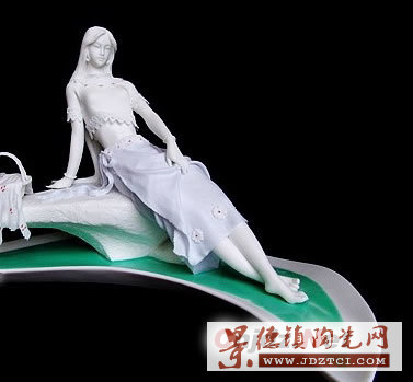 該瓷雕作品由一個(gè)美麗的少女坐在月牙泉邊的一塊石塊上棲息,表現(xiàn)了人與大自然和諧的意境。作品造型新穎,線條流暢,體現(xiàn)作品的藝術(shù)美。