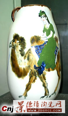 展品中的高溫顏色釉裝飾,是李菊生經(jīng)歷了多年艱難探尋,終于成功掌握了高溫顏色釉特點(diǎn),并用于裝飾人物的衣裙飾物、山石、鳥獸。這就大為拓展了陶瓷藝術(shù)的裝飾材料領(lǐng)域,極大地豐富了陶瓷藝術(shù)的裝飾語匯和表現(xiàn)手段,將藝術(shù)陶瓷的裝飾材質(zhì)提升了一個(gè)檔次。