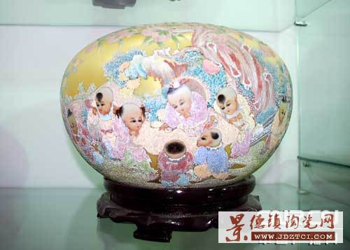 熊璧如拿著一個(gè)名為“嬰戲圖”的水晶繡彩瓷制品對(duì)記者介紹,這個(gè)“嬰戲圖”就是經(jīng)過(guò)了三次燒成的,在第一次燒成型后,我要將人物的皮膚上填色后再進(jìn)爐燒;等二次取出后我還要再將人物的臉部面容再次進(jìn)行仔細(xì)勾畫(huà)填色后進(jìn)爐,這樣三次進(jìn)爐燒出來(lái)的瓷器,不僅人物造型會(huì)栩栩如生,而且整個(gè)構(gòu)圖也都更為豐滿(mǎn)。特別是從不同的角度會(huì)看到不同的藝術(shù)效果。