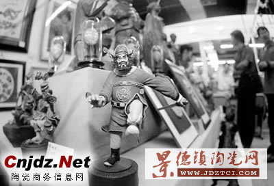 景德鎮(zhèn)“藝博齋”展位,展出了直徑1.16米、標價28萬元的“九龍紋描金祭藍大盤”,令人拍案稱奇。江西民間工藝美術大師鄔書遠,將云南瓦片“龍鳳呈祥”圖案、北方剪紙“吉慶有余”圖案等民間藝術,首創(chuàng)用于青花瓷器上。