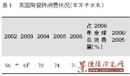 2006年英國(guó)消費(fèi)的陶瓷磚為76百萬(wàn)平方米,位居全球第20位!