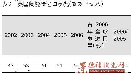 2006年英國(guó)進(jìn)口陶瓷磚總量為66百萬(wàn)平方米,位居全球第五位!排在美國(guó)、法國(guó)、德國(guó)、沙特阿拉伯之后。