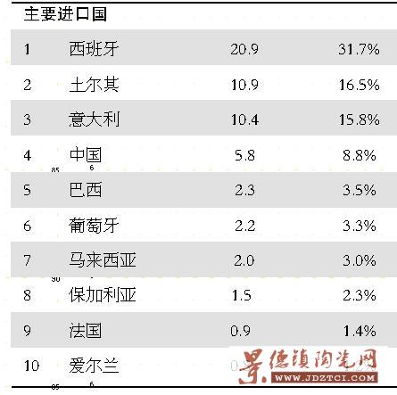 西班牙是英國(guó)陶瓷磚最大的進(jìn)口國(guó),排第二、三的分別是土爾其和意大利,中國(guó)是英國(guó)第四大陶瓷進(jìn)口國(guó),2006年中國(guó)對(duì)英國(guó)出口陶瓷磚5.8百萬(wàn)平方米,占英國(guó)進(jìn)口量的8.8%。