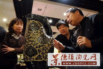 中國工藝美術(shù)大師劉立忠(右一)向觀眾介紹他的磁州窯代表作品黑釉剔刻《蓮花尊》