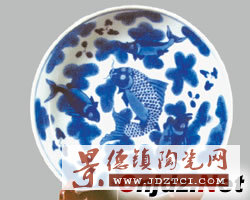 盤(pán)徑28厘米,撇口、淺腹、胎質(zhì)細(xì)白、釉色亮青,釉下用青花繪四種魚(yú)類(lèi)和水藻,象征吉祥如意,青花發(fā)色藍(lán)艷,從其器型、胎釉、青花呈色等方面分析,應(yīng)為清代康熙晚期景德鎮(zhèn)民窯燒制,惜盤(pán)沿有殘缺,其市價(jià)在千元左右。