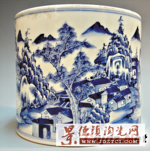 ●康熙青花山水紋筆筒可看到清晰的水紋,生動有力。