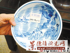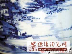 仔細觀察可見仿制品的紋飾散亂,而且畫工甚為粗糙。真品就完全不同,如“康熙青花山水紋筆筒”,繪畫明顯有著“清初四王”(指四大王姓的書畫名家王原祁、王時敏、王鑒、王翚)的筆意(這是康熙晚期山水人物青花特點之一),而仿品看不出章法。從局部對比,新仿青花山水紋筆筒的江水不見任何紋路,只是混沌一片;民國仿康熙山水紋筆筒的江水稍有紋路,但仍是一片模糊;而康熙青花山水紋筆筒便明顯可看到清晰的水紋,生動有力,畫工之精粗一比較便有明顯結論。