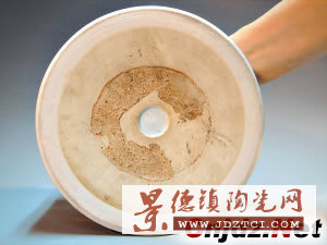 康熙青花山水紋筆筒底部就是一個典型的例子:1.底部形成俗稱的“壁底”;2.半露胎、中間有釉,在底部形成三圈,中間一圈沒釉;3.底部在燒制時因為高溫受冷收縮而形成“桔皮棕眼”。