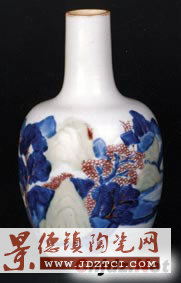 1995年夏,我去寧、滬、杭尋寶時,在南京朝天宮古玩市場買到了一件康熙“釉里三色”山水景物圖長頸瓶。