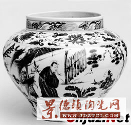 元青花瓷人物題材的作品歷來稀少,據(jù)目前不完全統(tǒng)計,國內(nèi)外僅10余件館藏品,且無一不具有極高的藝術(shù)價值。人物題材瓷器的出現(xiàn)和元代戲曲小說與版畫的發(fā)達(dá)有著密切的聯(lián)系。當(dāng)時雜劇、戲劇、歷史故事盛行,景德鎮(zhèn)的工匠將其中有關(guān)情節(jié)繪在瓷器上,頗有意趣,從而顯現(xiàn)了一種新的藝術(shù)境界。罐的器形正適用于描繪敘事性圖案,因此常繪有元曲或通俗故事。這件元青花大罐上所繪的圖案別具一格,值得一書。