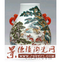 乾隆時(shí)期的粉彩綜合了康熙與雍正兩朝的制瓷工藝,乾隆帝對(duì)有些粉彩器物的用途、形體、花紋的要求常有御旨。此尊為乾隆皇帝壽誕時(shí)所燒制,高45厘米,口徑16厘米,足徑24.2厘米。尊敞口,口以下漸廣,垂腹,圈足。肩部?jī)蓚?cè)各有一螭耳。尊體繪百鹿,襯以山林、小溪、靈芝、花草等景物。蒼松翠柏下群鹿或奔跑,或相偎,或憩息,形態(tài)各異。經(jīng)專(zhuān)家們認(rèn)真研究瓷藝大師反復(fù)實(shí)踐,終于再現(xiàn)了這一器物的神韻。