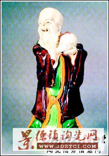 該像通高28厘米,胎質堅硬,壽星面部、手部及壽桃均施白釉,外衣、靴施褐色釉,內衣用綠色,飄帶為黃色。