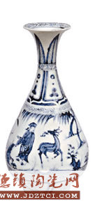 該青花人物紋玉壺春瓶制于元代,高30厘米、口徑8厘米、底徑8.8厘米。玉壺春瓶是元代盛行的器形,基本沿襲宋代制式,但較宋代顯得厚重飽滿。該器物撇口、細長頸、廣圓腹、圈足。內口沿繪一周纏枝花紋,頸部為蕉葉紋及如意紋,腹部主題紋飾為人物故事圖,足壁是如意紋。青花色調淡雅,用國產青料所制。圖案豐富,主次分明。胎細白,釉汁滋潤,白中閃青,反映元代景德鎮(zhèn)制瓷工藝水平,為國家一級文物。