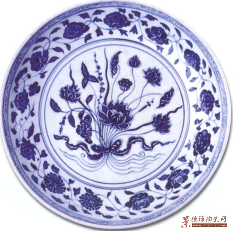 盤淺腹坦底,有矮圈足。器表施釉,釉層純凈勻稱。底足露胎,胎質(zhì)細(xì)膩潔白。白胎上用鈷料繪出藍(lán)色圖案,然后罩上一層亮度極高的透明釉。潔白的胎體映襯天藍(lán)色紋樣,這便是陶瓷史上著名的青花瓷。青花是釉下彩繪的一種,是對(duì)白地藍(lán)花的專稱。典型青花瓷系選用含金屬鈷的彩料在陶洗細(xì)膩的瓷坯上做畫,然后施一層透明釉,在高溫下一次燒成。中國(guó)最早的青花瓷是唐代產(chǎn)品,明代永樂(lè)、宣德二朝是青花瓷的黃金時(shí)代。自此以后,青花瓷成為中國(guó)瓷器的主流。今天人們所使用的日常餐具也以青花瓷為大宗。