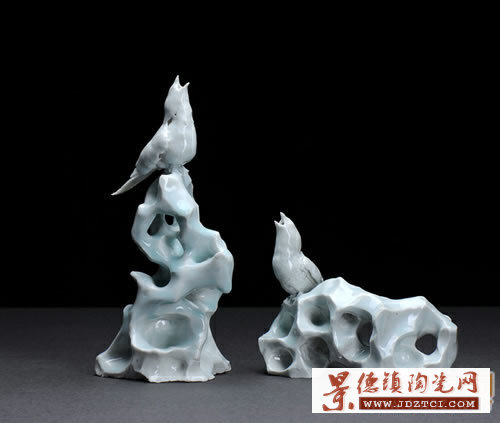 黃有彬的瓷塑作品“頌”充滿生機(jī)盎然的趣味,俏皮靈動(dòng)的小鳥(niǎo)立于山石之上,把鳥(niǎo)鳴歡暢的熱烈和喜悅傳達(dá)給我們,淡雅抒情的青釉的使作品多了一份寧?kù)o的雅致。藝術(shù)家對(duì)自然之美的贊嘆猶如奏響的一曲歡歌,映入眼簾、流進(jìn)心里,我們對(duì)青年陶藝家的未來(lái)充滿期許。