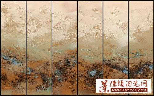 藝術(shù)家因?yàn)樯羁臻g、美學(xué)教育等因素,其作品的面貌會(huì)呈現(xiàn)出全然不同的面貌,多年旅居意大利的朱迪創(chuàng)作的高溫色釉瓷板“喜馬拉雅系列”,雖然與其攝影作品呈現(xiàn)的面貌完全不同,但是表達(dá)的對(duì)自然的無(wú)比熱愛(ài)以及用抽象語(yǔ)言來(lái)傳達(dá)的藝術(shù)理念是相同的。他采用的陶瓷元素,運(yùn)用高溫色釉將喜馬拉雅描繪的直入人心,“大面積的暖色和灰色銜接,濃重如焦墨的筆觸厚重如鐵,暗色山體和飛揚(yáng)的云雪,油畫(huà)味十足;高溫釉特有的潤(rùn)澤窯變,恢弘的氣勢(shì)是這一系列作品的標(biāo)準(zhǔn)符號(hào)” ,“朱迪的裝飾性很難定性,喜馬拉雅系列我們很容易看到審美的傳承,東方的西方的,過(guò)去的現(xiàn)代的,寫(xiě)實(shí)的寫(xiě)意的,但總有一些說(shuō)不出的陌生和愉悅,絲毫沒(méi)有語(yǔ)言的不確定和躁動(dòng),而是靜宜的存在!?jiǎng)⑼钕妗保莫?dú)特視角另其作品呈現(xiàn)出一種恢弘大氣的面貌。