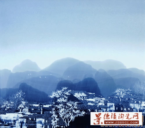 陶瓷學(xué)院教授羅小聰卻選擇用傳統(tǒng)的釉下青花語(yǔ)言,來(lái)表達(dá)對(duì)中國(guó)山水的情有獨(dú)鐘。不同于傳統(tǒng)青花顏料的使用方式,用自稱為“剃青”的方式將版畫(huà)的風(fēng)格用于瓷畫(huà)的創(chuàng)作,而青花作為釉下彩顏料在釉下又有一種流動(dòng)性,層層暈染之下把中國(guó)畫(huà)的水墨精神融入到青花繪畫(huà)之中,藝術(shù)家對(duì)工藝技法的熟練掌握使其作品表達(dá)流暢自如,恰到好處的濃淡輕重,深深淺淺的藍(lán)色在瑩潤(rùn)的釉面之下宛轉(zhuǎn)流動(dòng),把青花這個(gè)顏料所能表達(dá)的優(yōu)雅、深沉、輕靈、厚重等藝術(shù)特征都酣暢淋漓的體現(xiàn)出來(lái)。畫(huà)面將青山綠水、村落人家描繪地如中國(guó)文人的終極夢(mèng)想“桃花源”般地優(yōu)美、迷人。
