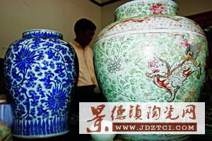| | 左為青花大罐,右為康熙五彩罐。記者浦峰攝 |