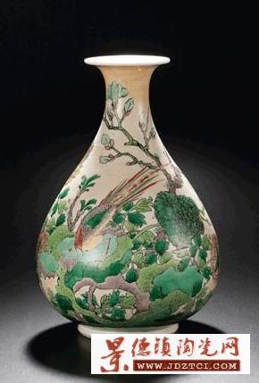 此件玉壺春瓶撇口,短頸,頸以下漸向外闊,至近底處內(nèi)斂,圈足微外撇。其腹部渾圓大氣,身形挺拔壯碩,予人典雅尊貴之感,有明顯繼承明末玉壺春瓶式 的痕跡,線條圓潤(rùn)敦實(shí),少了一絲秀雅,多了一份雄渾,瓶身通體上米色釉,上釉旋轉(zhuǎn)痕跡明顯,主體紋飾于米黃色釉上以五彩繪洞石錦雞玉蘭牡丹紋,寓意錦上添花,玉堂富貴,所繪紋飾工細(xì),全部圖案均以墨線描邊,然后在輪廓內(nèi)填彩。紋飾圖案繁復(fù)工整,于錦俏熱鬧之余,尚有一絲文人畫氣息,靈動(dòng)鮮活,惹人喜愛,而此瓶之紋飾與釉彩裝飾,則相對(duì)特殊,色地加彩在康熙之前的五彩器物中比較少見,明代曾有罐、爐一類以紅綠彩為地的彩繪器,但裝飾手法較為單一,所用顏色也相對(duì)簡(jiǎn)單,而此件器物則安排了綿密繁復(fù)的圖案及畫面,雉雞紋的形象源自中國(guó)特有的鳥類紅腹錦雞,其翎羽華麗,色彩鮮艷,因極具裝飾效果,所以古人常以之入 畫,又因?yàn)槠渖嗜A麗,又有錦繡繁華之意,配合其周邊所繪的竹石牡丹及玉蘭花卉,寓意吉祥,此圖案為康熙朝經(jīng)典裝飾紋樣,在青花及青花五彩器物中反復(fù)出現(xiàn),可資參閱的例子也較多,后世有所繼承。在米釉上繪五彩紋飾為康熙朝新創(chuàng)裝飾方法,殊為罕見,即便是康熙本朝器物,也不為多見,因與之相類者寥寥,所以此風(fēng)格的玉壺春瓶于拍場(chǎng)更是十分稀見,目前已知北京故宮博物院有一件清宮舊藏的米黃釉五彩玉壺春與之風(fēng)格相同,但紋飾有所差別,高度略高于本件,且瓶底同 樣無款。