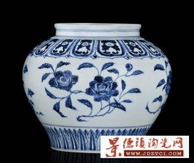 此罐是明代瓷器裝飾風(fēng)格的典范。一改元青花的繁密華縟而代之以疏朗清秀,纏枝花卉于蓮瓣紋予人一種高雅大方的美感。紋飾與優(yōu)美的罐體相襯,愈顯宮廷 奢華之氣,展示了景德鎮(zhèn)官窯匠師非凡的藝術(shù)才華。整器用進(jìn)口的“蘇麻離青”料繪制,筆法活潑流暢,線條粗細(xì)并用,彩料濃淡兼施。且不論著色深淺,紋飾效果 皆極為絢麗鮮艷、清新明快。在線條的紋理中布滿鈷鐵的結(jié)晶斑點(diǎn),呈星狀點(diǎn)滴暈散,彩料濃重處則凝聚成黑青色結(jié)晶斑。正因?yàn)榍嗔洗艘惶匦裕町嬅娓挥谒?般揮灑淋漓、蒼翠欲滴的意趣。所形成的此種藝術(shù)效果,“蘇麻離青”料固然是一方面原因,但更主要的還是匠師自身所具備的藝術(shù)修養(yǎng)與繪制技巧。每組花卉的形 態(tài)均系以極富中國(guó)畫傳統(tǒng)筆墨意韻之勾、勒、點(diǎn)、染等技法繪就,畫筆細(xì)膩傳神,表現(xiàn)出枝葉的翻轉(zhuǎn)扭曲、偃仰起伏之態(tài);花、枝、葉間的疏密聚散同樣是借鑒了國(guó) 畫的結(jié)構(gòu)布局,得其法度,極富寫實(shí)效果,充分體現(xiàn)了匠師扎實(shí)深厚的筆墨功底;疏密有致的鋪排在視覺上亦形成了張弛有度的藝術(shù)效果。